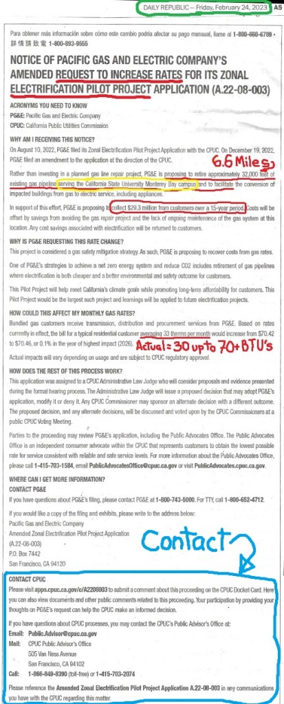 ATTENTION in NOR CAL…Natural gas prices have recently dropped…but your PG&E charges are going to CONTINUE TO GO HIGHER…until customers PROTEST these rates. Attached is the latest PG&E Rate Increase Application public notice was published in ALL adjudicated newspapers.