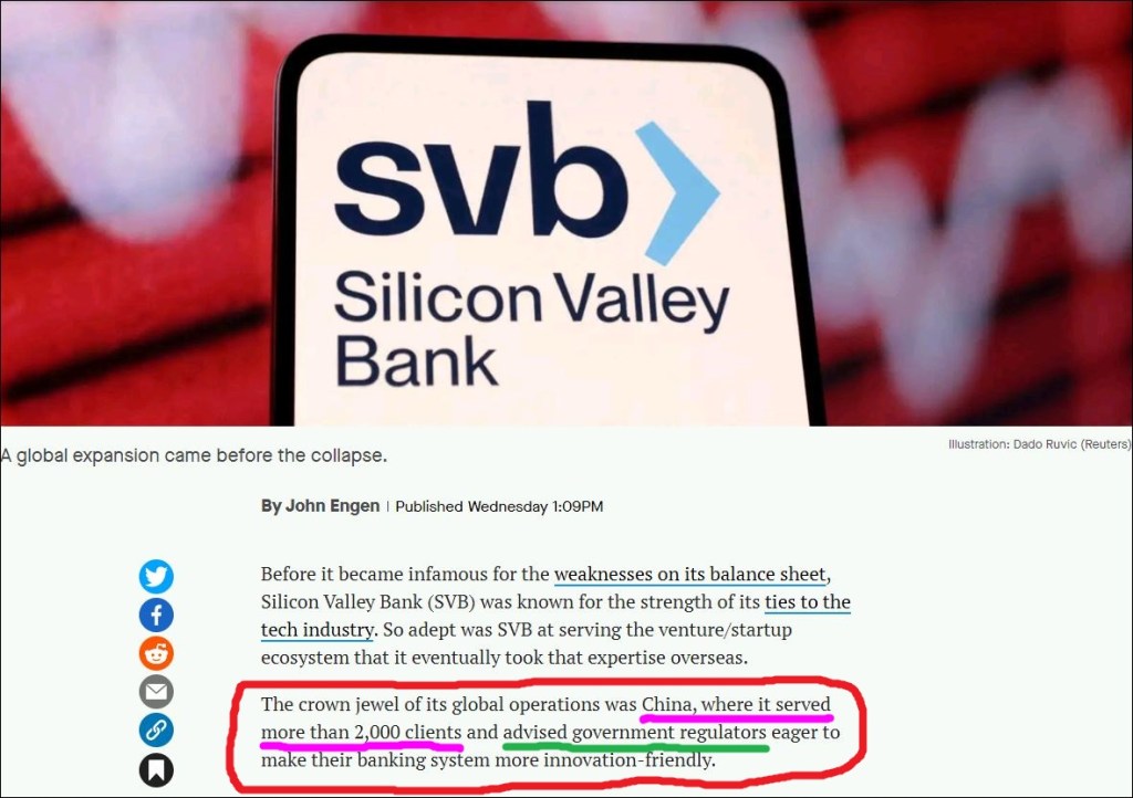 …Good Morning FRIENDS…NEW CONCERN…just a question…asked with very little research…but it seems to me…SVB’s failure is gonna have MASSIVE REPERCUSSIONS!!! It seems that SVB has/had more than 2,000 Chinese Accounts…and no less than three physical office locations in MAINLAND CHINA!!!…(full disclosure here…I am NOT a financial/banking person…just a simple hard rock minor of FACTS) that being said…then…with FJB/Yellen’s All Deposits will be made whole GOVERNMENT BAILOUT, seems to me that the American Taxpayer is bailing out CHINA!!! Tell me if I am wrong!!!
