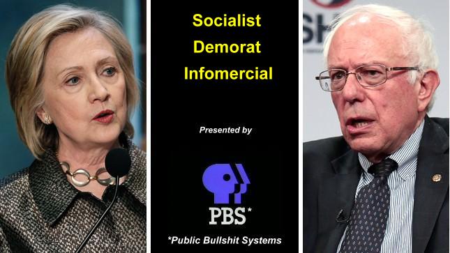 Boy oh boy!!! If you watched the Clinton-Sanders “debate” last night…it was the latest in the Clinton Sanders Infomercials. Not one question was asked about Clinton’s FBI email investigation, not one question was asked about $6 Million in donations accepted from George Soros and not one question was asked about Clinton’s “public trust” issues. Or was Sanders ever asked what bills he has authored as a Congressman since 1991 or what he accomplished since 2011 as a long-time ranking member of the Senate Veteran’s Affairs Committee. As far as we could tell, this was the newest two hour Socialist Democrat Party infomercial…and not a thing more! Once again PBS should be ashamed!!!